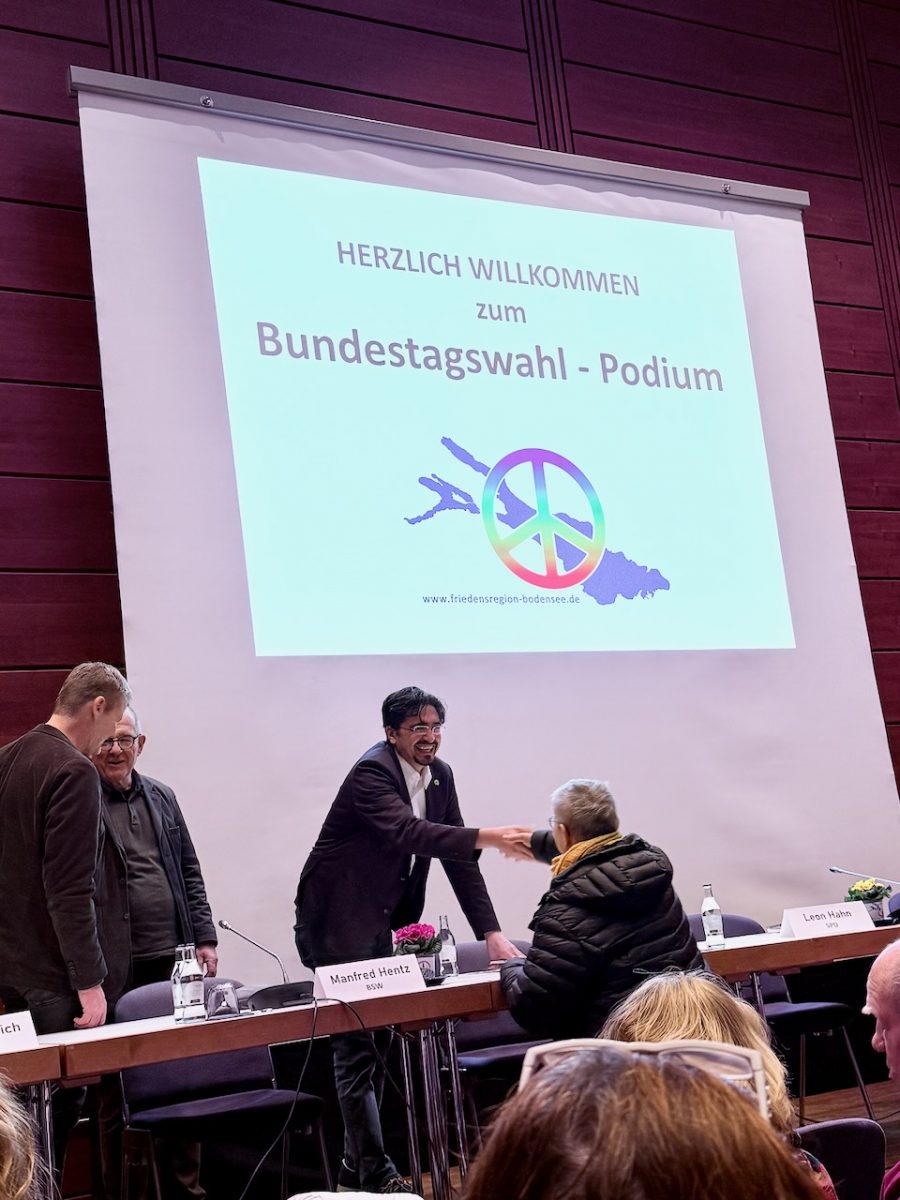Am 07. Februar hatte der Verein Friedensregion Bodensee e. V. Vertreter der für den Bundestag kandidierenden Parteien zu einer Podiumsdiskussion zur Friedenspolitik eingeladen. Von SPD, B90/DIE GRÜNEN und DIE Linke nahmen die jeweiligen Direktkandidaten teil. Der Kandiddat der FDP hatte kurzfristig abgesagt, ebenso wie der Vertreter des Direktkandidaten der CDU. Die Direktkandidatin der AFD scheint es generell nicht für nötig zu halten, an Diskussionen in ihrem Wahlkreis teilzunehmen und schickte einen Vertreter. Das BSW, obwohl im Wahlkreis mangels Kandidat*in überhaupt nicht wählbar, durfte trotzdem einen Vertreter schicken. Und hier beginnen die Merkwürdigkeiten eines sehr schrägen Verständnisses von Diskussionskultur und Demokratie.